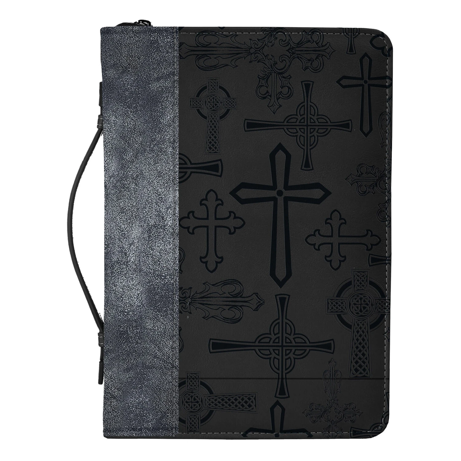 Cross Design Bible Cover features many different crosses across the coverCover is made of polyurethane faux leather with midnight black and silver tone finishBible cover is size x-large and measures approximately 11 x 8 x 2 inchesEmbellished with applique and hot stamp features; Includes zippered closure and spine carrying handle