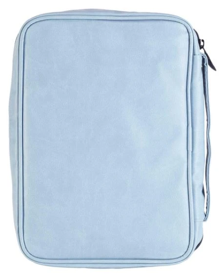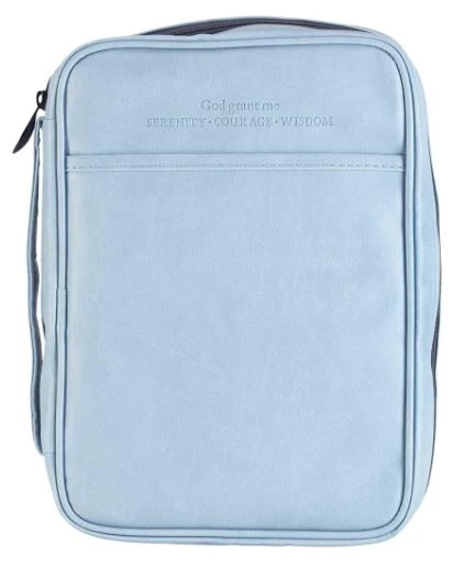 Soft light blue vinyl Bible cover is imprinted with the words “God grant me Serenity Courage Wisdom” from the Serenity Prayer. Features a large open