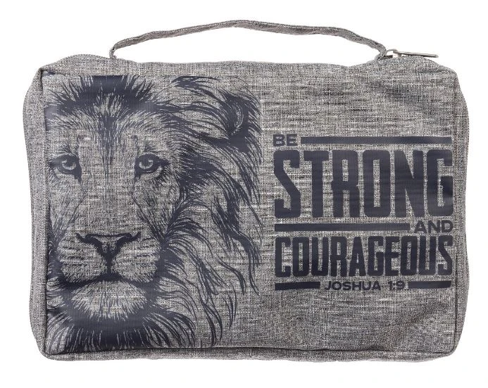 Store your Bible in a sturdy Bible case with a fierce and encouraging message when you use the Strong and Courageous Lion Gray Value Bible Cover—a Bible