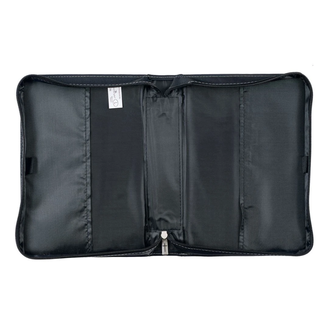 The Walk by Faith Black and Gray Faux Leather Classic Bible Cover will protect any Bible and look good in the hands of your family patriarch, whose bold